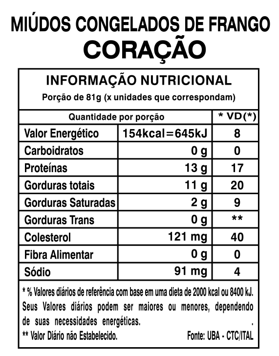 Coração VOLTAR O Coração União está disponível através de embalagens de polietileno, granel com peso médio de 1kg por pacote. Todos os frangos abatidos são criados sem o uso de hormônios, como estabelece a legislação brasileira.